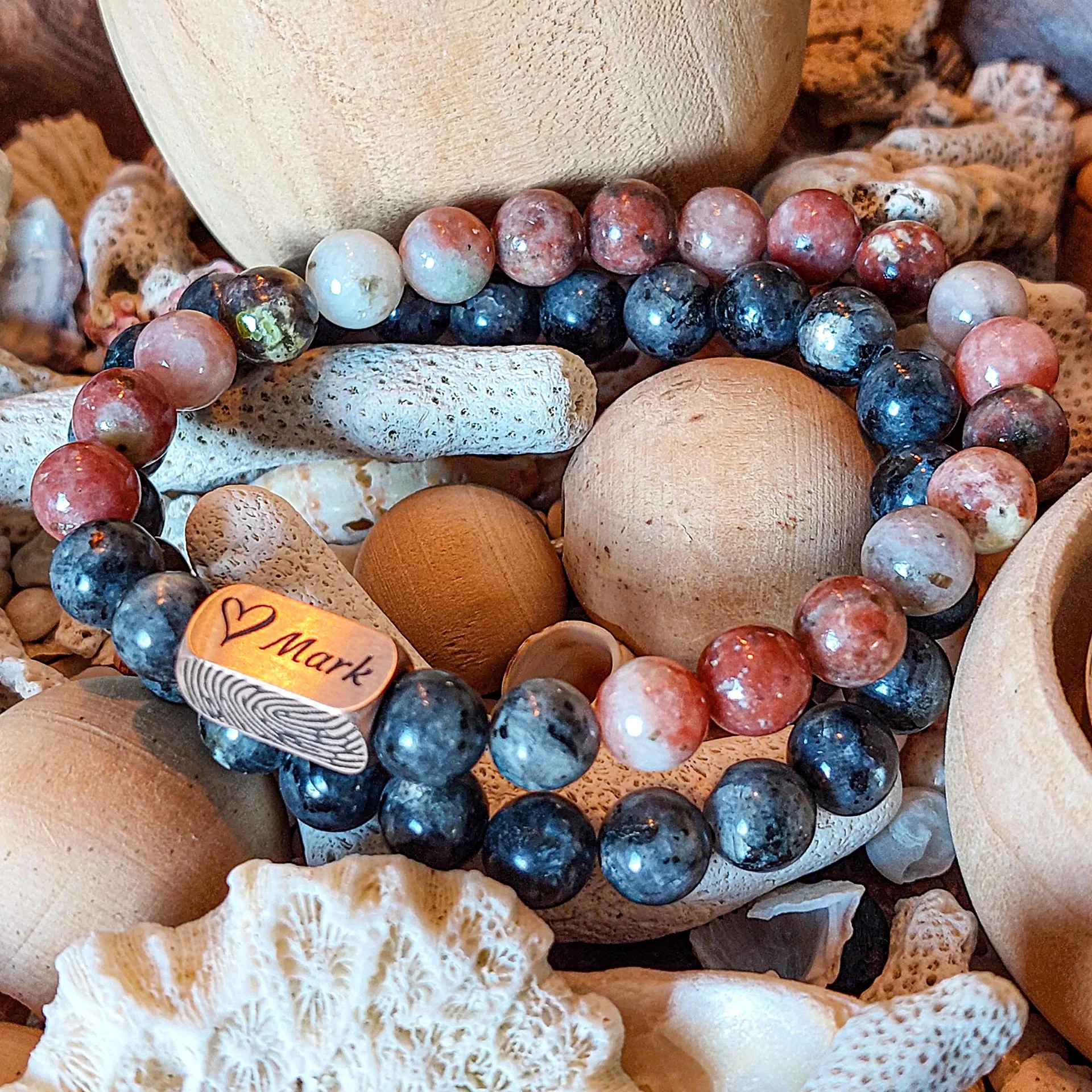 Draag een sieraad met betekenis met onze Vingerafdruk Kralen Armband Set. Deze exclusieve set bestaat uit twee hoogwaardige 8mm natuurstenen armbanden in de stijlvolle kleuren Cherry Blossom Jaspis en Zwarte Labradoriet.